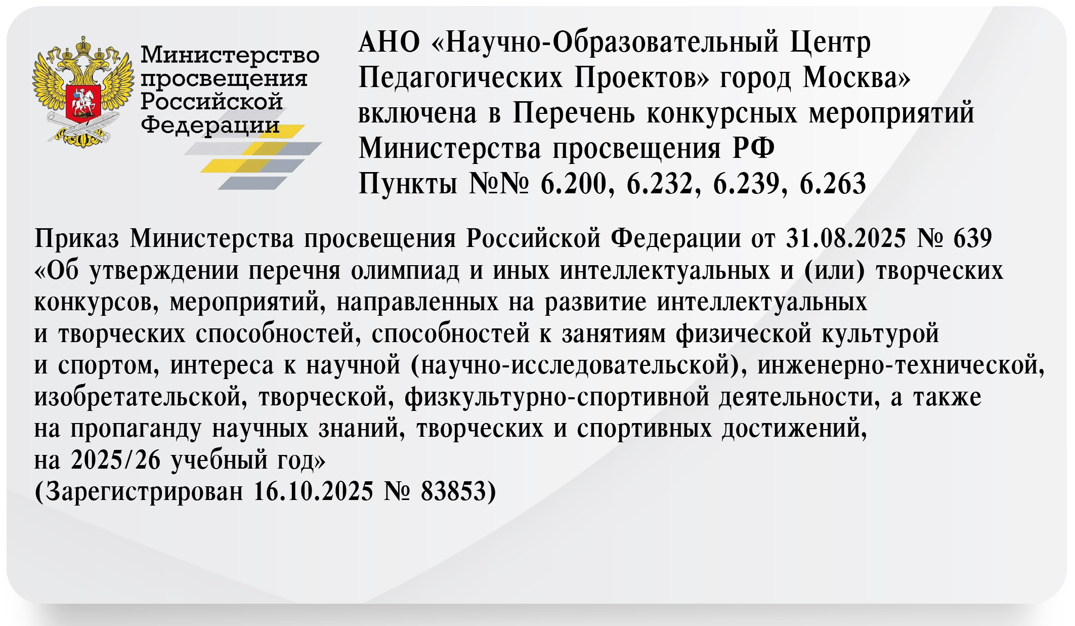 Приказом Министерства просвещения Российской Федерации АНО «Научно-Образовательный Центр Педагогических Проектов» город Москва» в 2025/2026 учебном году включена в Перечень конкурсных мероприятий Министерства просвещения РФ и является официальным организатором конкурсных мероприятий.