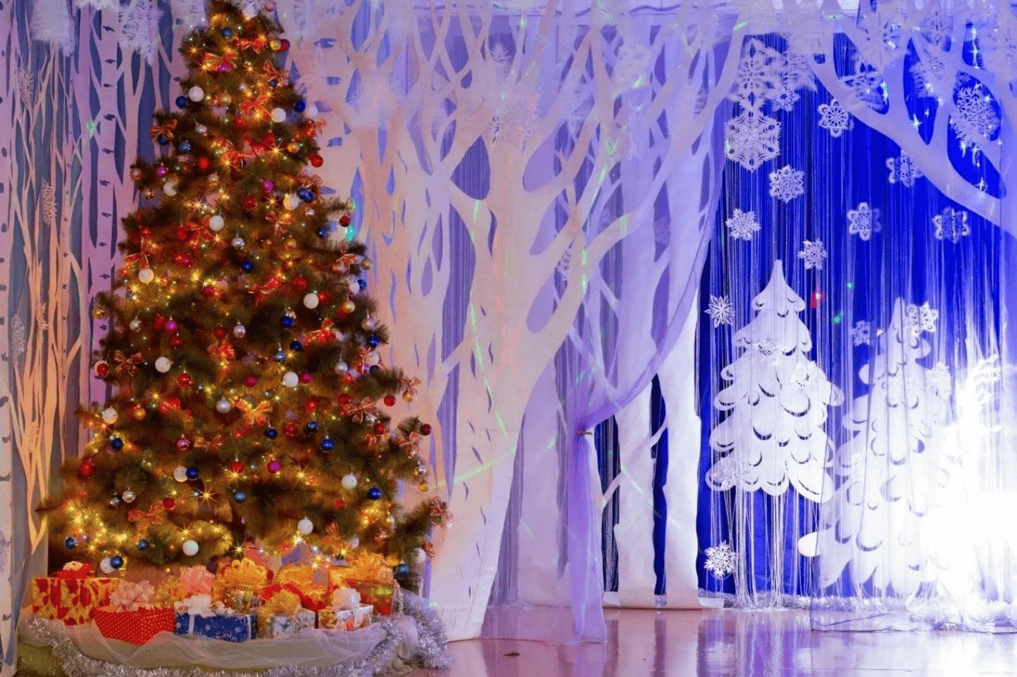 — Оформление актового и спортивного залов: сцена и декорации (украшенная ёлка, гирлянды и новогодние декорации, новогодние баннеры и плакаты и другое);