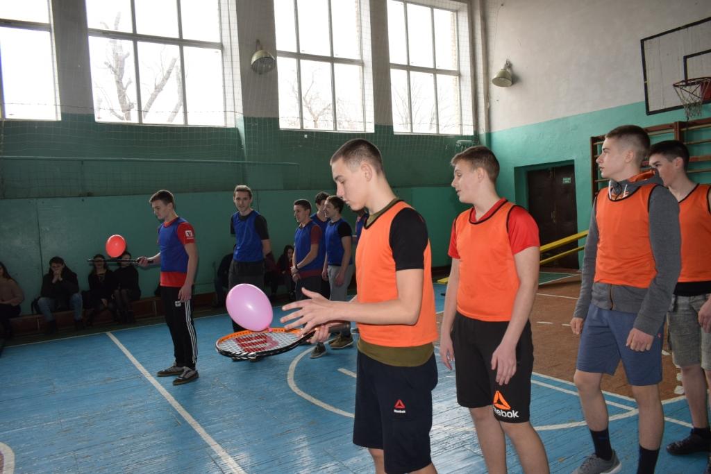 У первого участника в руках ракетка для большого тенниса и воздушный шарик. По команде «Марш» он как можно быстрее бежит к установленной на расстоянии 6 м фишке, подбивая ракеткой шарик, обегает его, возвращается и передает эстафету следующему участнику. Шарик не должен падать на пол. Побеждает команда, которая закончила эстафету первой.