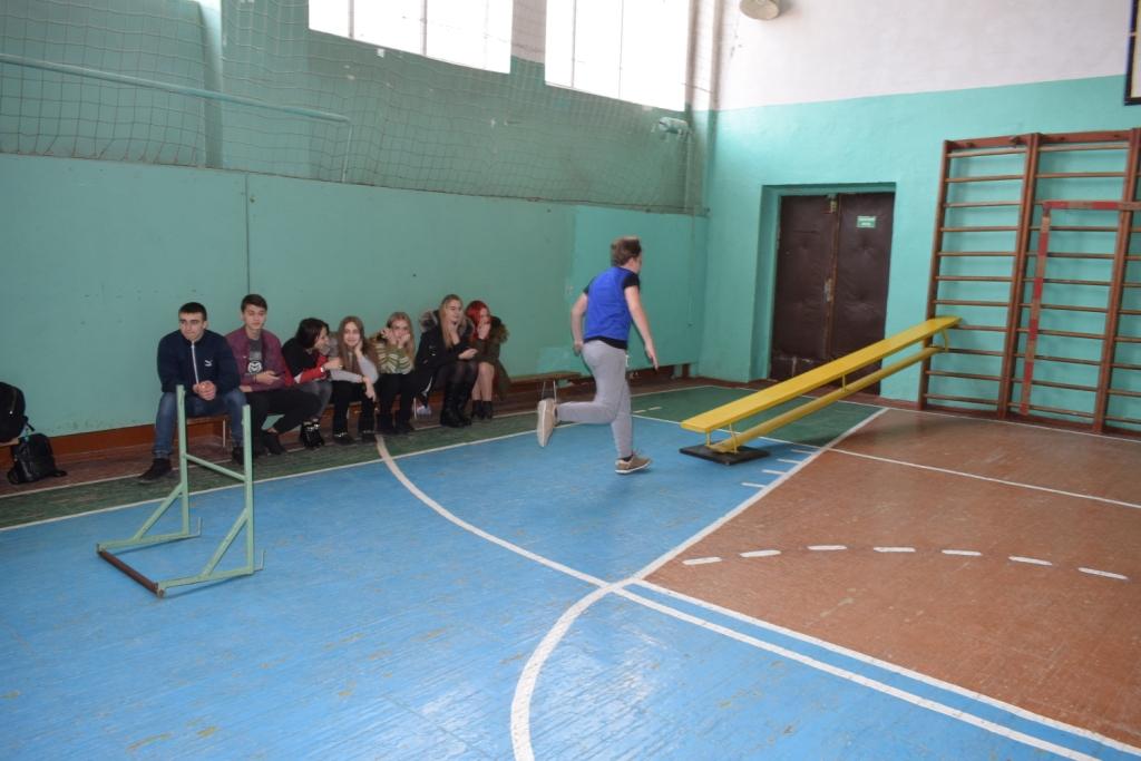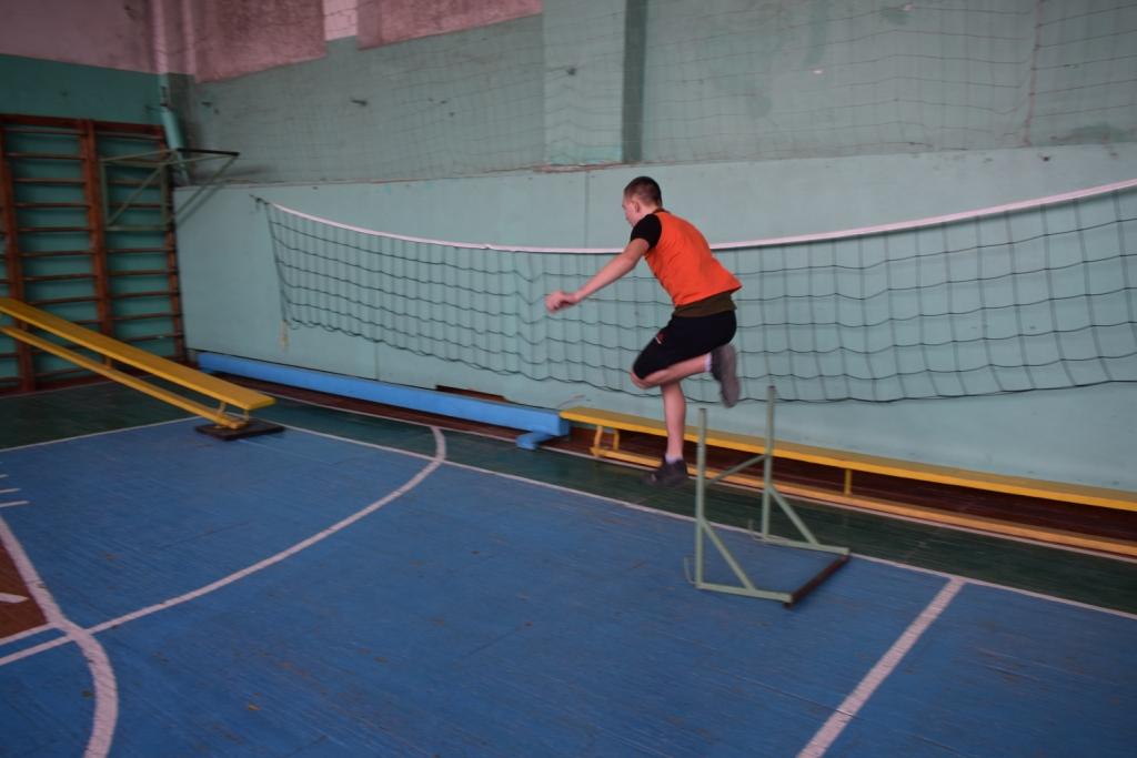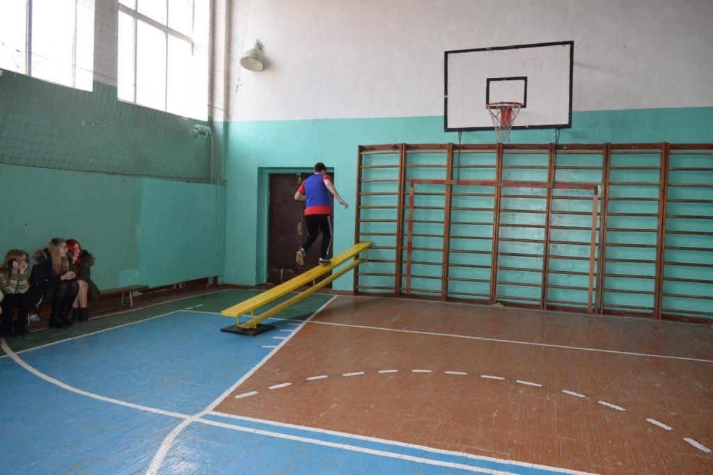 На линии старта у первого участника в руках канат для лазания (в спортивном зале есть два каната, прикрепленных к потолку симметрично). По команде судьи участник, схватившись за канат выполняет «маятник» с приземлением за контрольной линией, подбегает к гимнастической скамье, ложится животом вниз и передвигается по скамье, подтягиваясь на руках, перепрыгивает через препятствие-барьер, пробегает по гимнастической скамье, которая поднята одним краем и закреплена на гимнастической стенке, спускается по гимнастической стенке, бежит обратно, делает кувырок вперед на гимнастическом мате, перед финишированием берет канат и отдает его следующему участнику, который находится на линии старта. Ошибка — +1с.