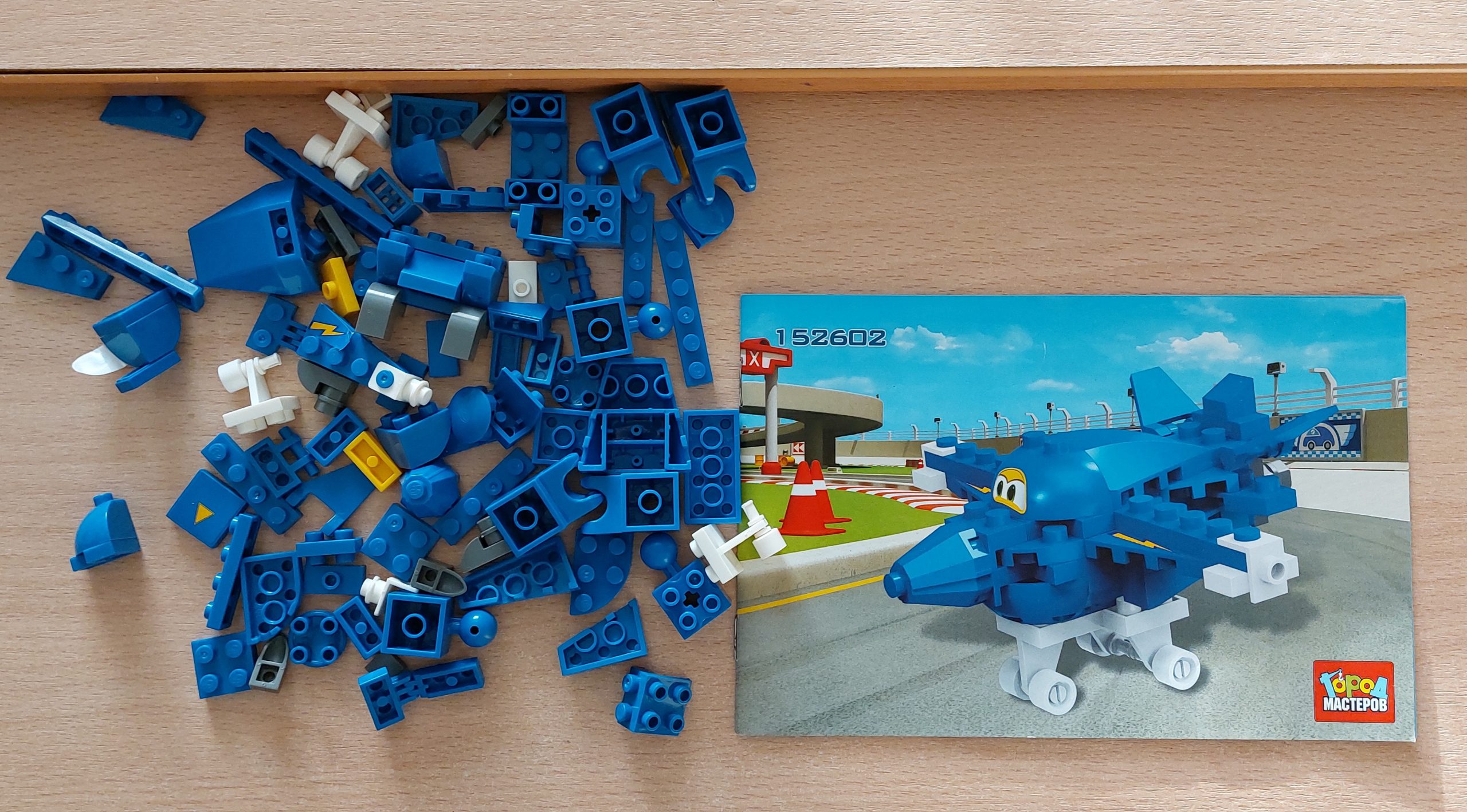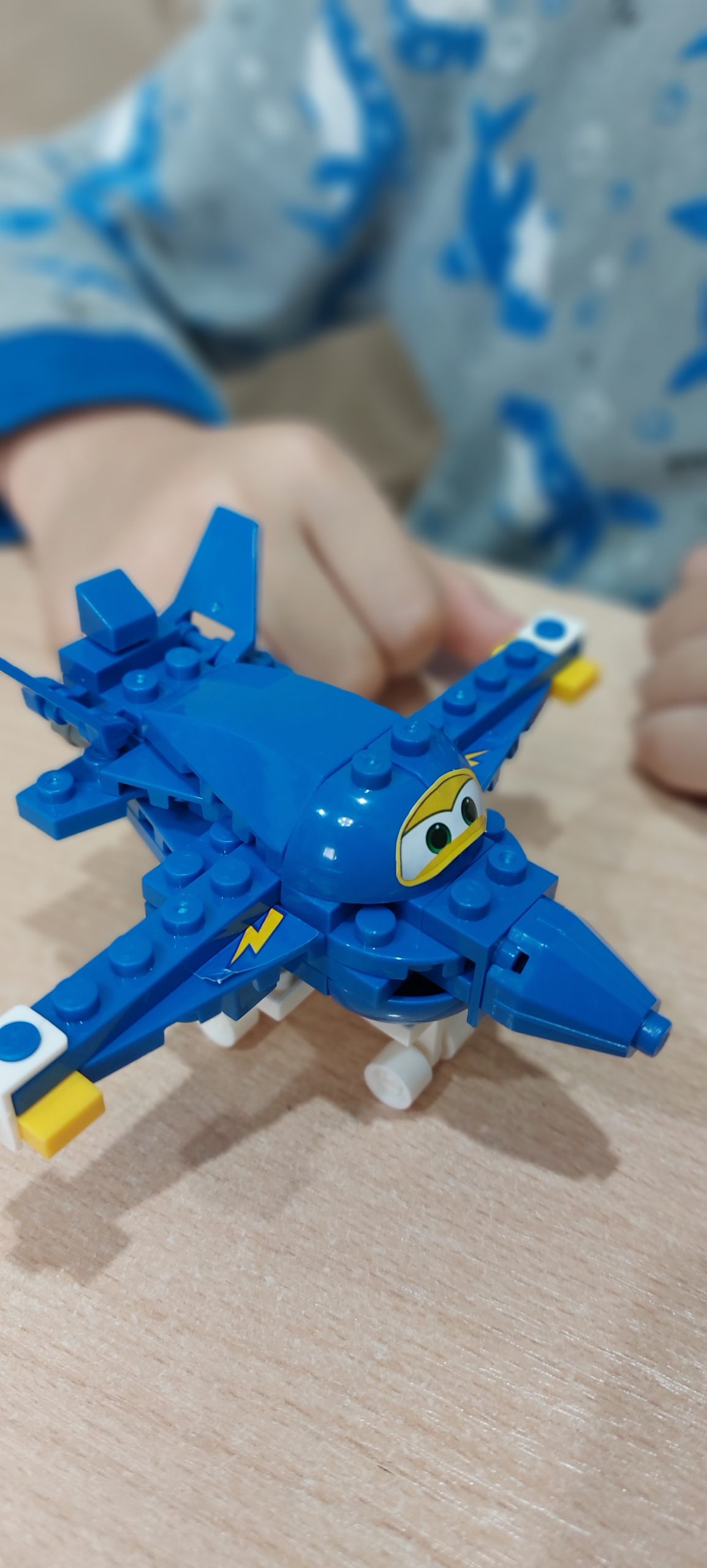 Причиной выбора такой модели конструирования стал один из любимых персонажей – самолёт Джером из мультфильма «Супер Крылья: Джетт и его друзья». Модель выполнена из конструктора ТМ «Город мастеров».